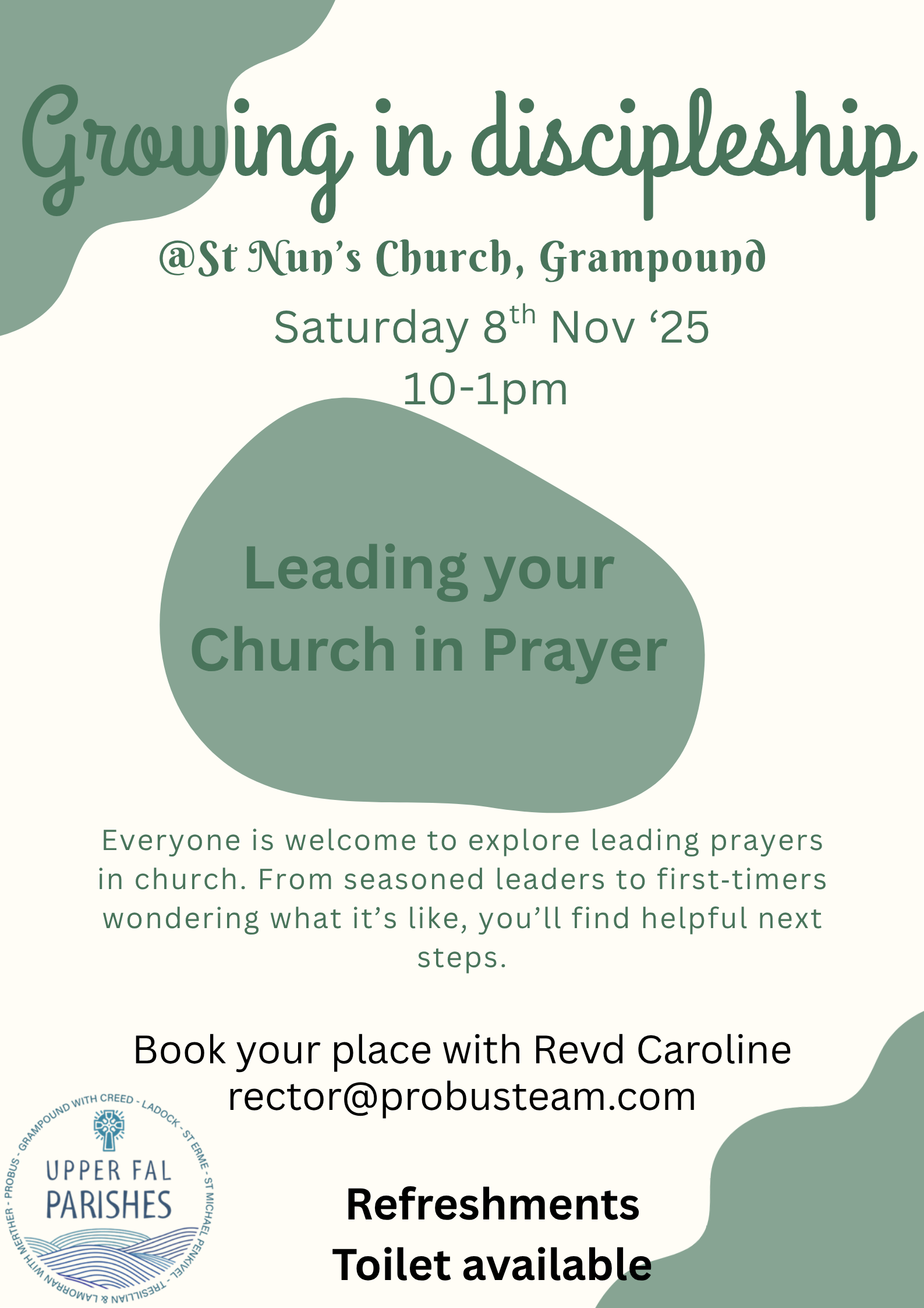 Leading your church in prayer is a workshop coming up on Saturday 8th November 10am to 1pm at St Nun’s Church.