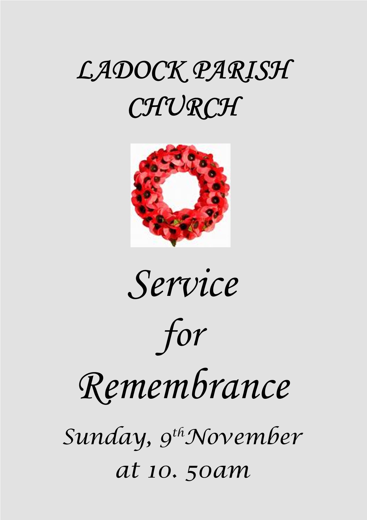 Sunday 9th November, 10.50 am. There will be an Act of Remembrance and two minute silence at the Ladock war memorial followed immediately by a special service in church as the nation remembers who have given their lives in the hope of making a difference to those they left behind.