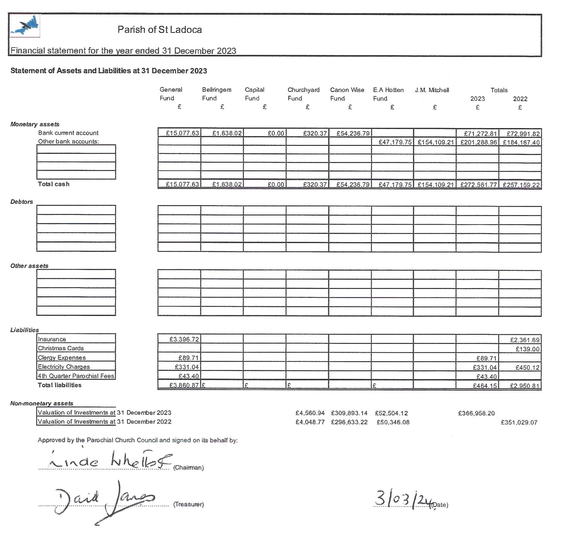 The Annual Report and Financial Statement of the Parochial Church Council for 2023 for presentation at the Annual Parish Church Council Meeting in Ladock Church on 11 April 2024.